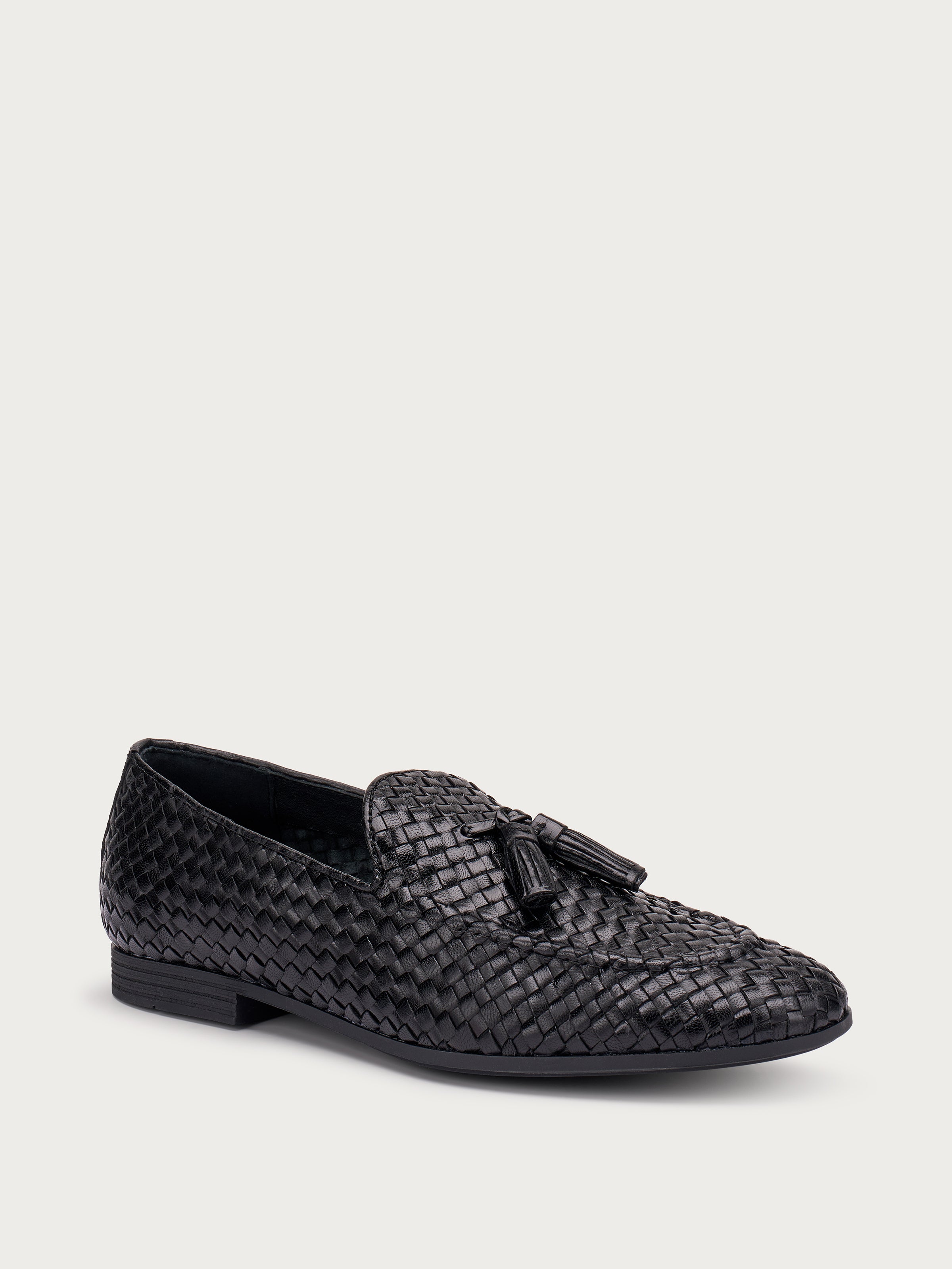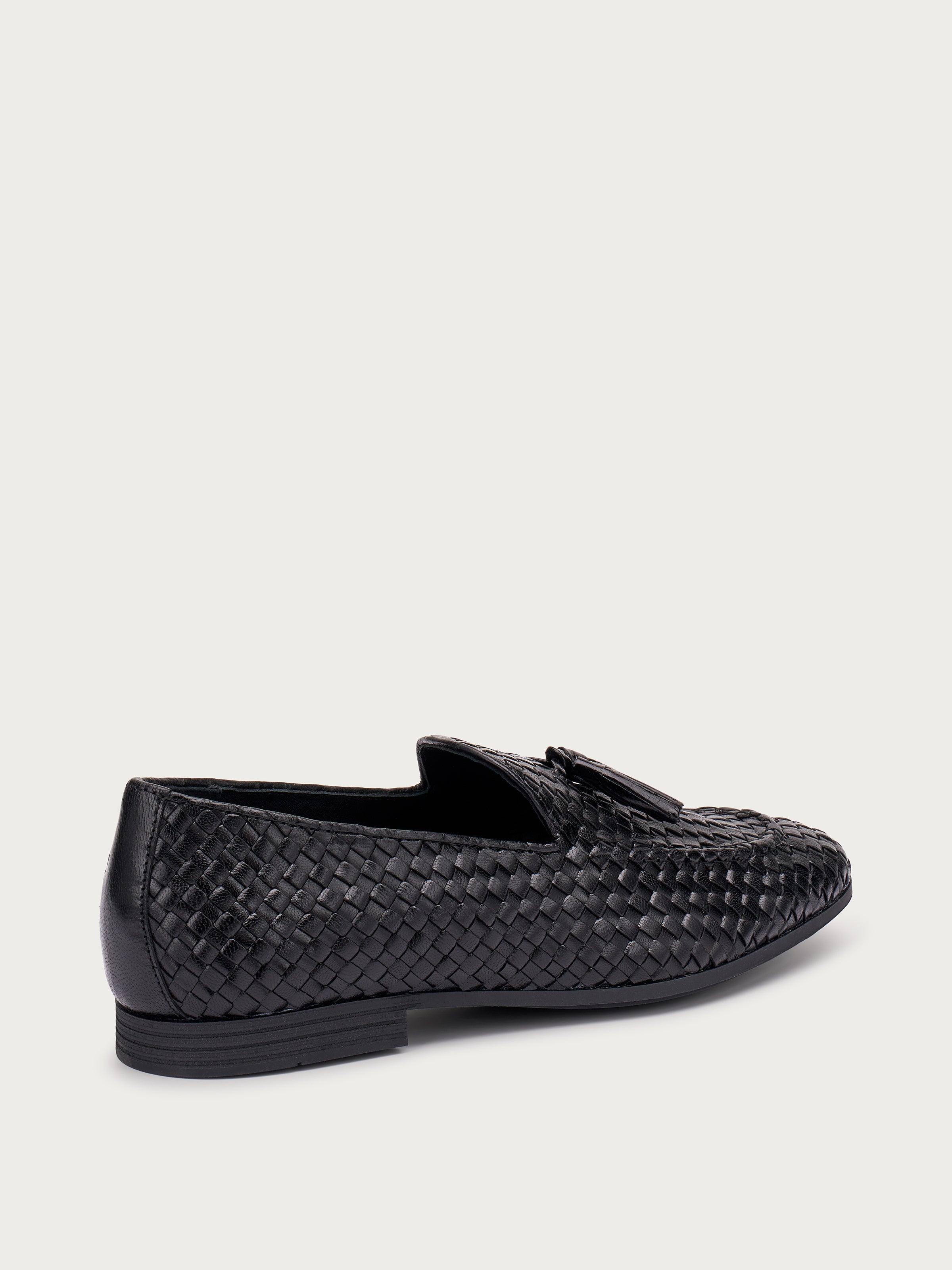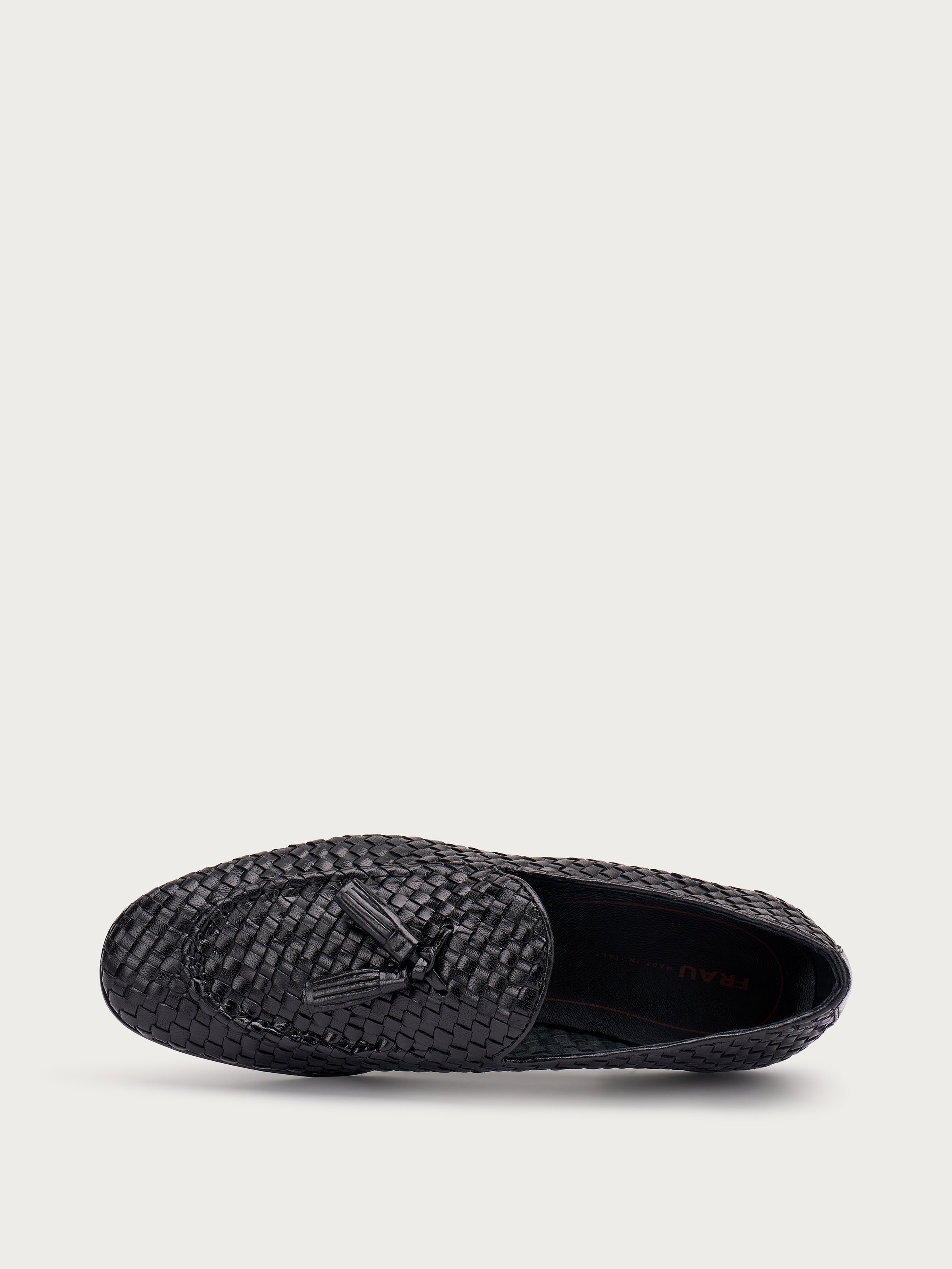 - Obermaterial aus handgeflochtenem Leder auf der Form, mit Quasten