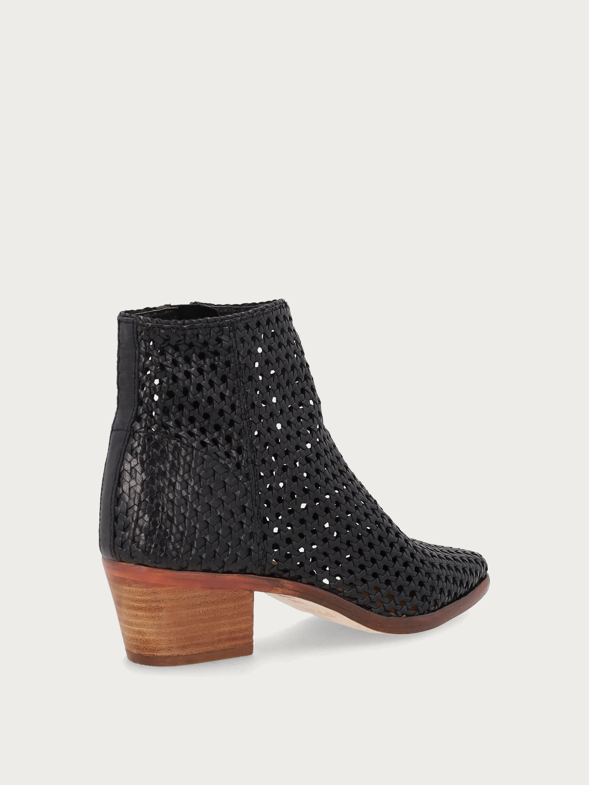 Texan leather ankle boots with a braided upper that plays with see-through effects. The bold lines express character and comfort, perfect for urban-chic outfits, boho looks or for adding personality to jeans and summer dresses. A must-have for summer