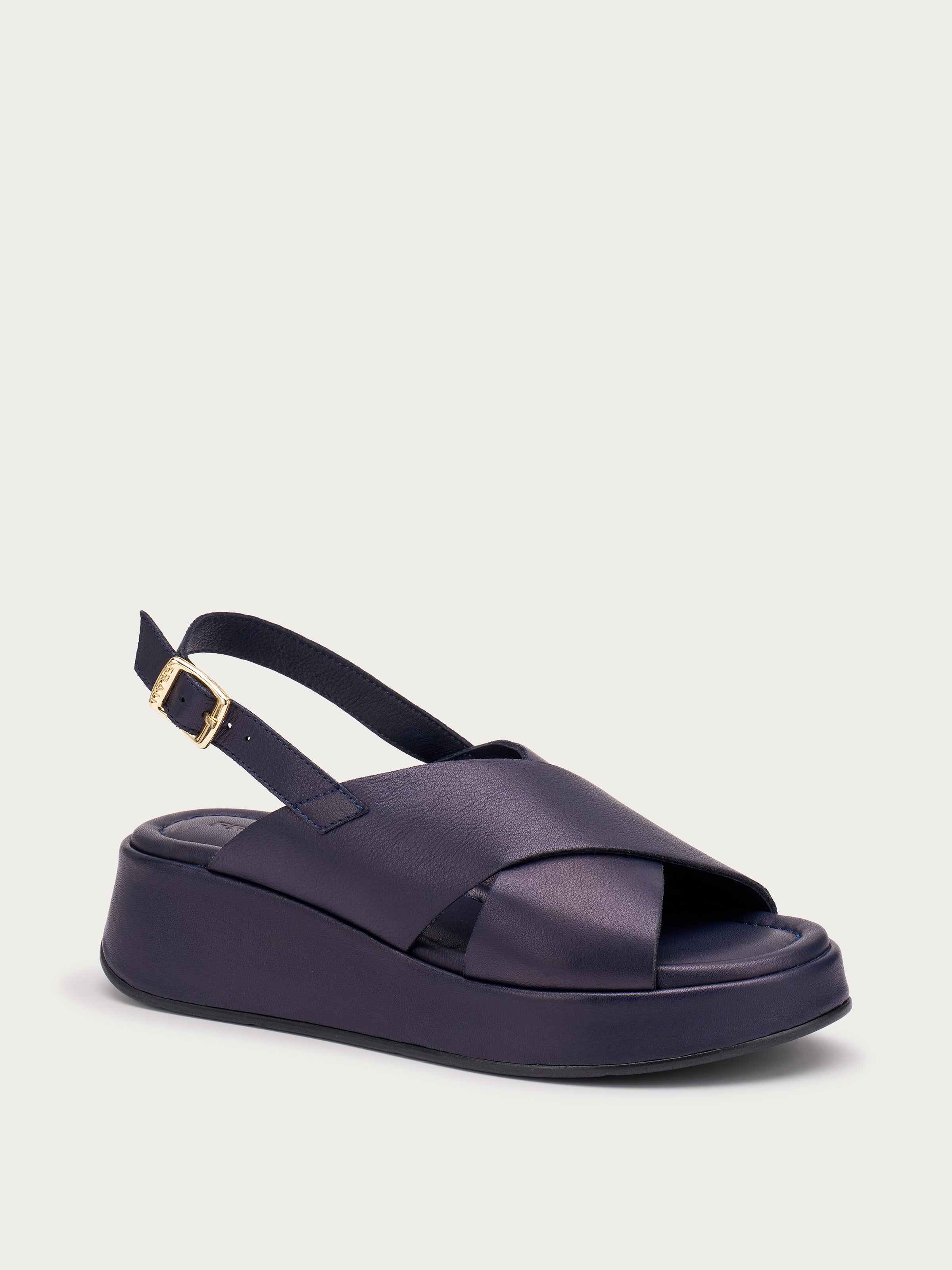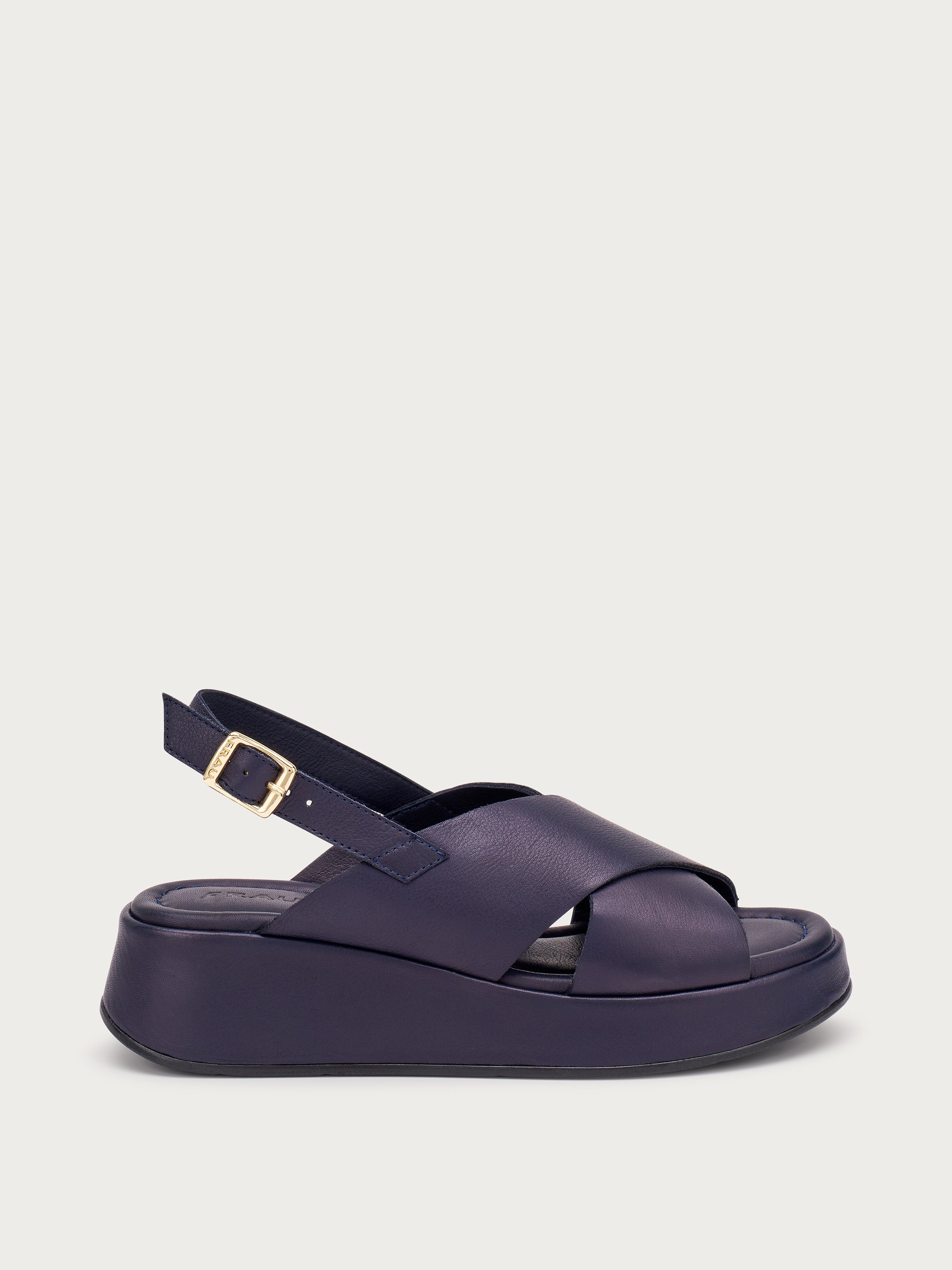 Elegant and comfortable soft leather sandals with crossover bands that wrap around the foot and a practical back strap, a combo that ensures maximum stability. The tone-on-tone platform discreetly slims the figure, combining femininity and comfort without heels.