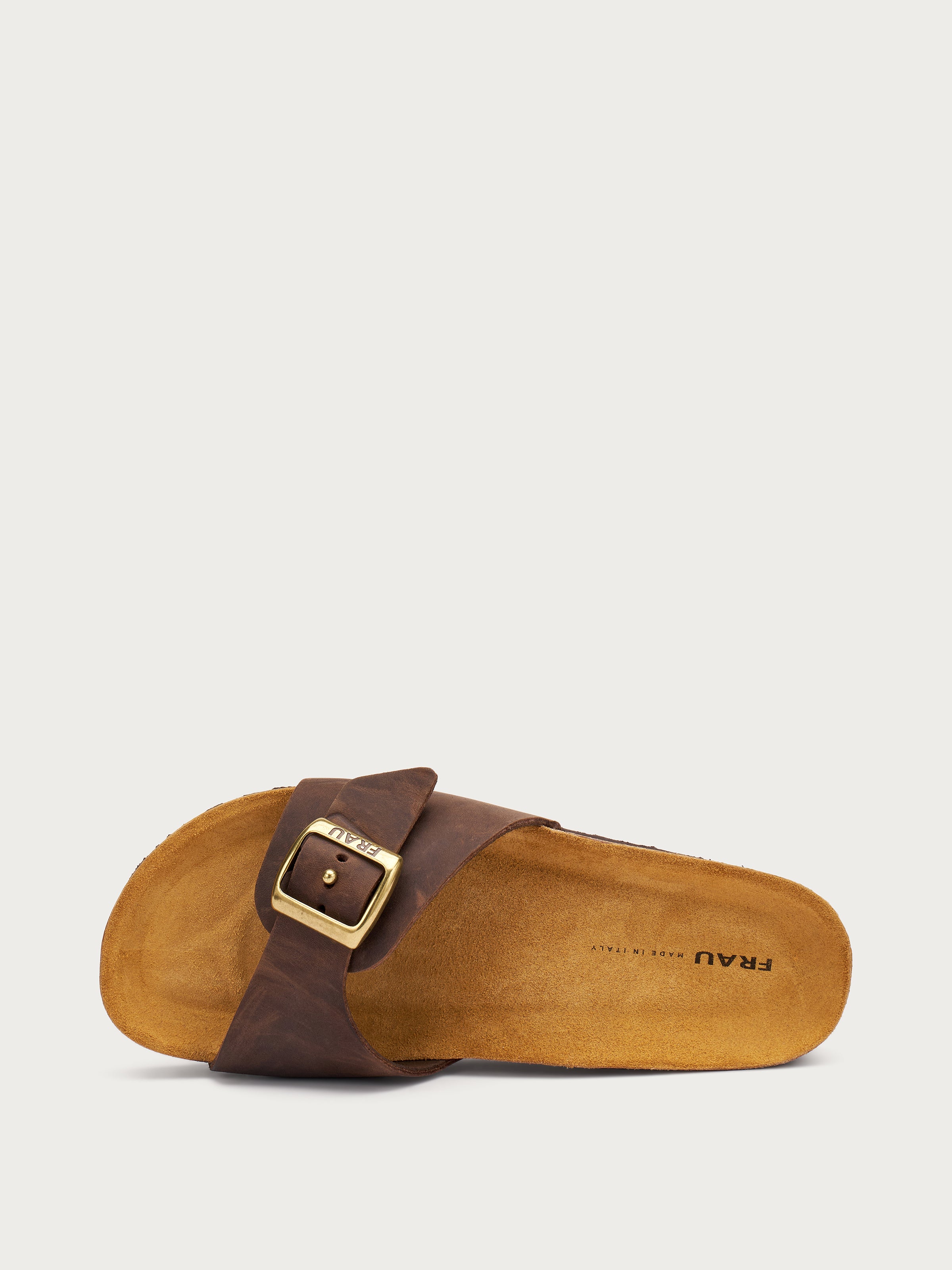 Oiled nubuck sliders with strap and cork footbed - Dark Brown | FRAU