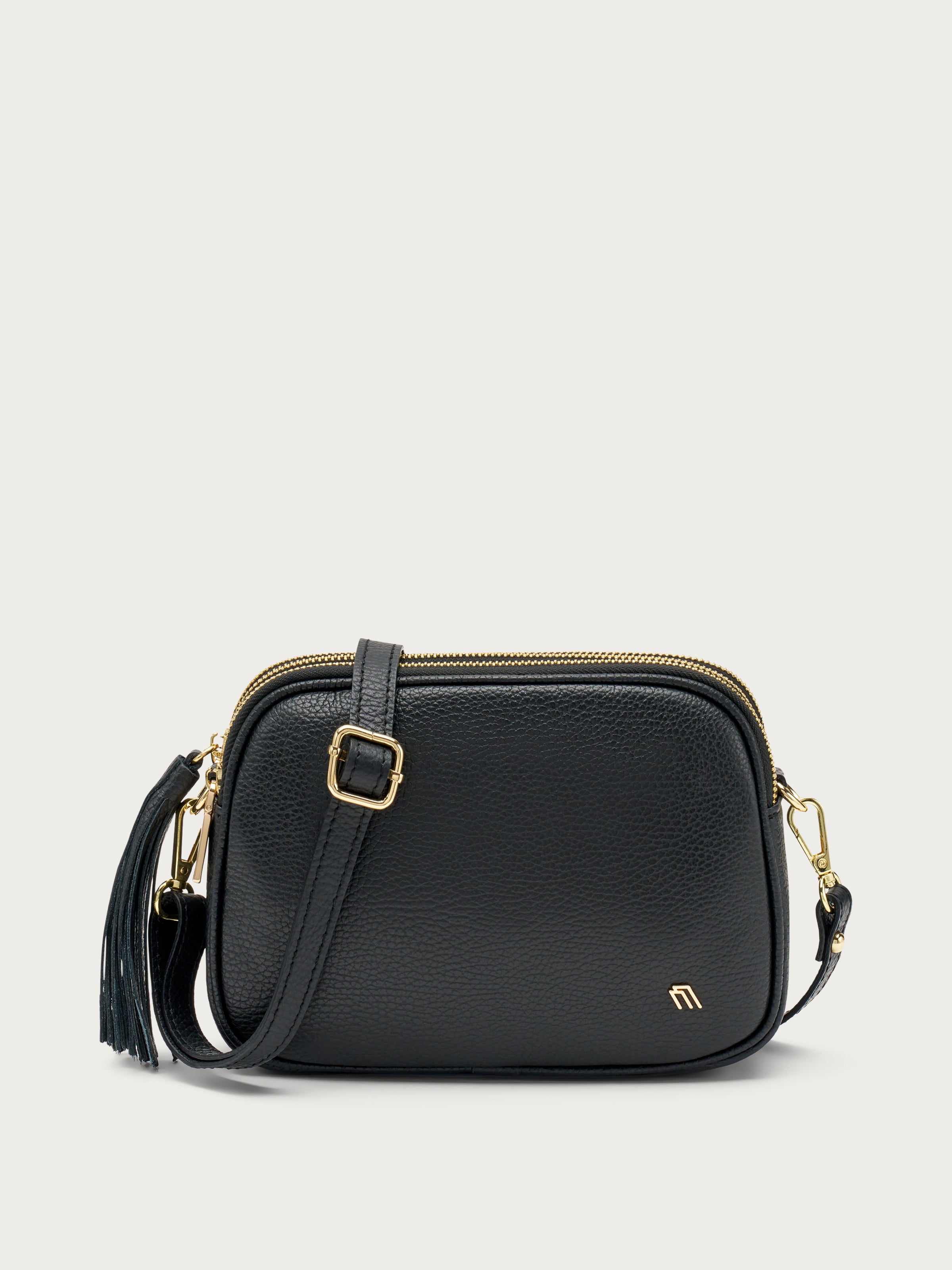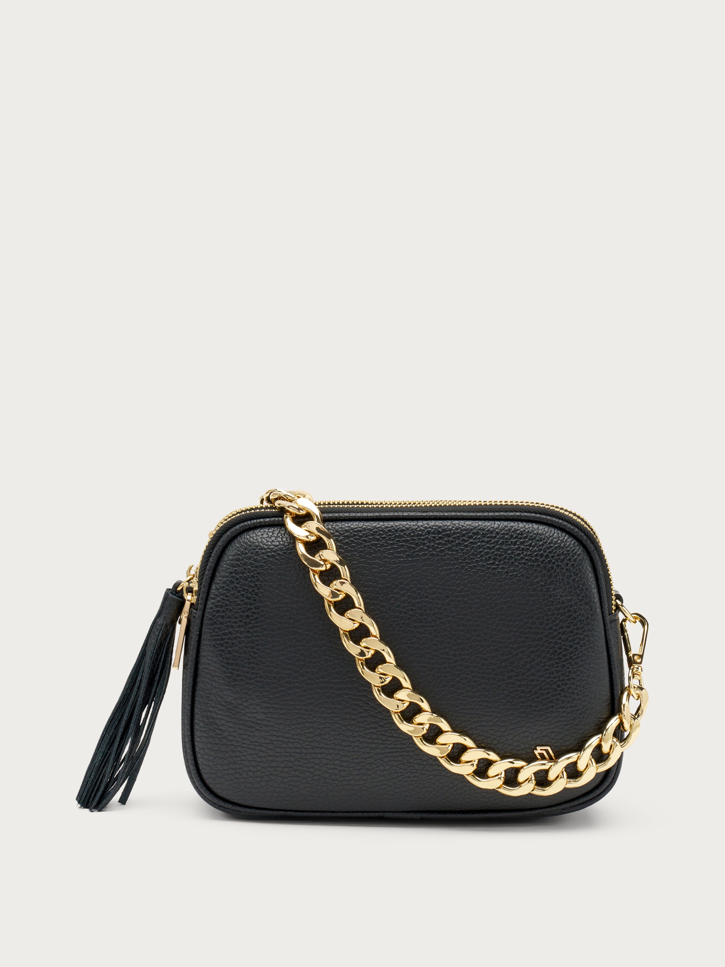 Synonymous with minimal design and practicality, thanks to the three zipped compartments that allow you to keep your personal items neatly divided. The small size and the elegant golden chain make this style ideal also when paired with more elegant outfits.