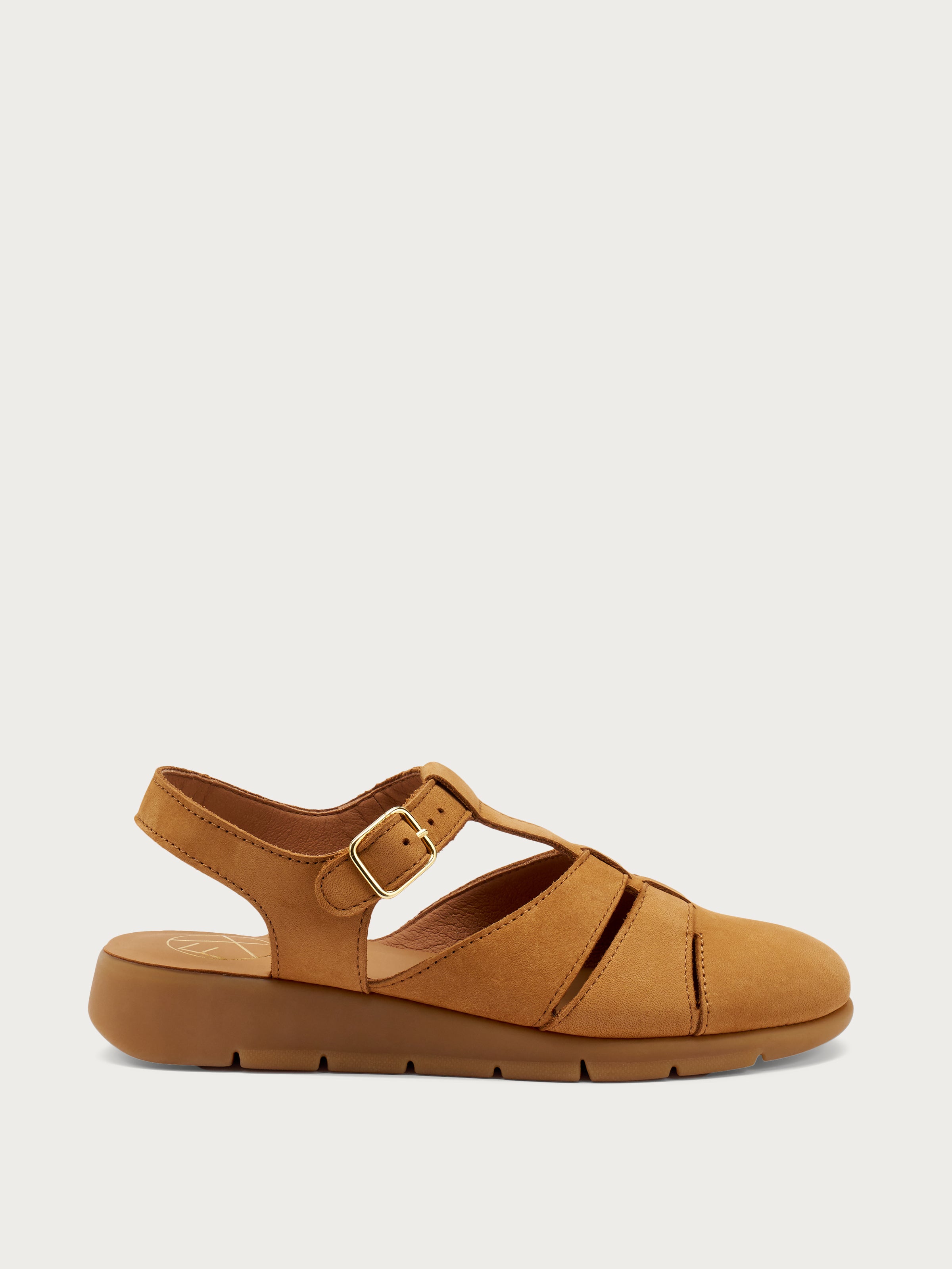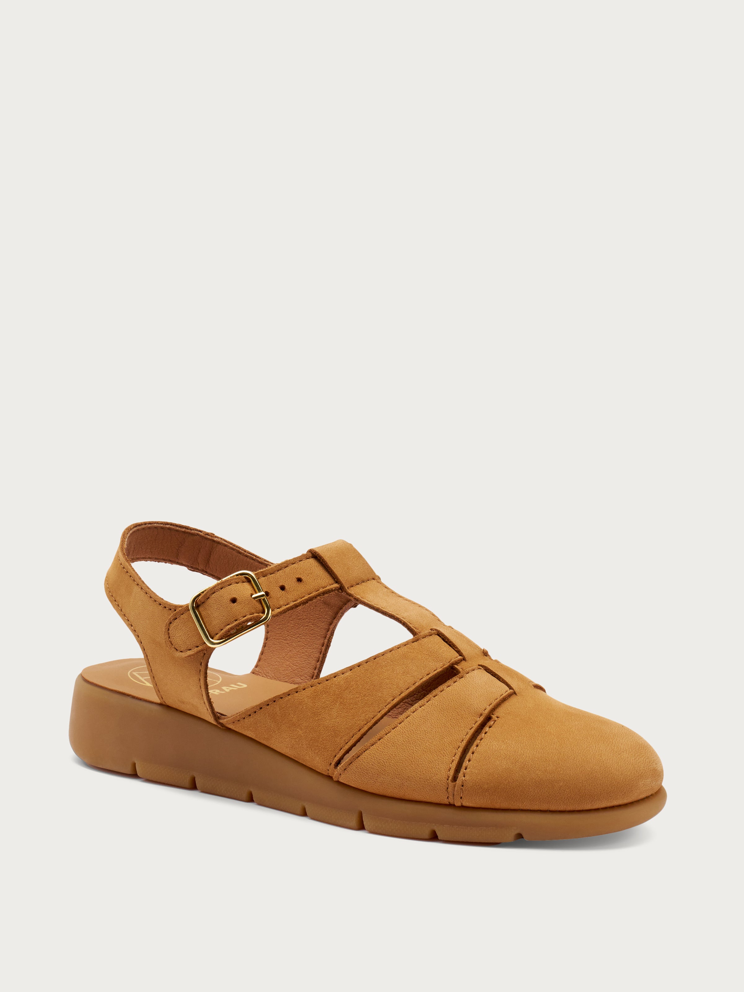 Soft nubuck sandals featuring a semi-open upper that gently embraces the foot while subtly revealing the toes, perfect for those seeking the freshness of a sandal with a more covered design.