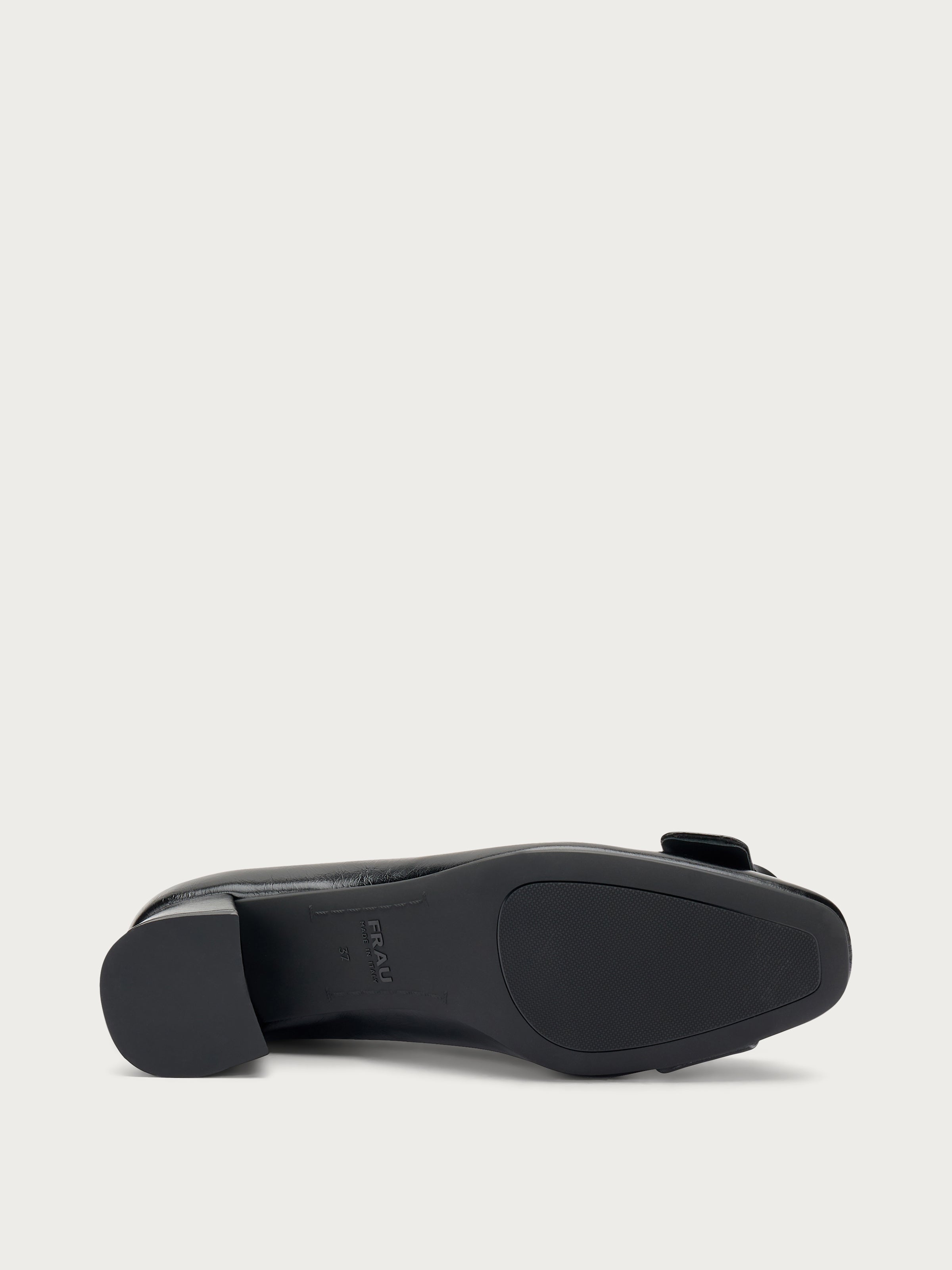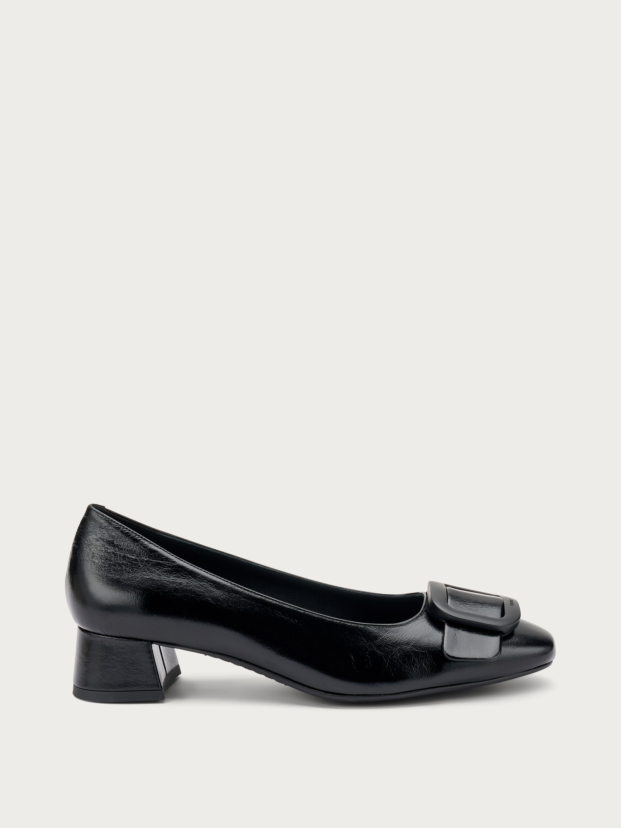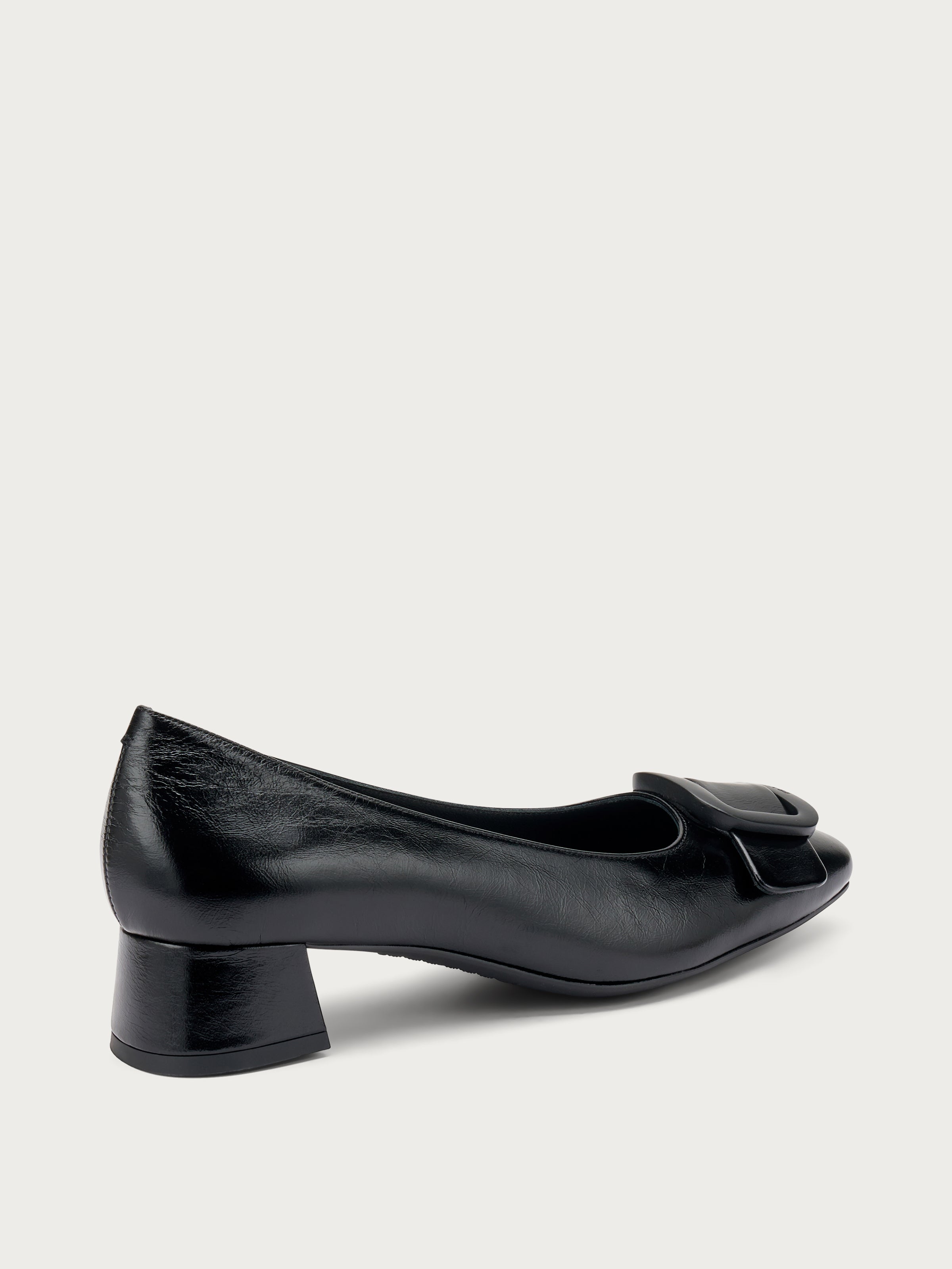 Poised between romance and practicality, these creased-effect polished leather pumps with low heel and modern matte contrasting accessory have endless opportunities for use and are so versatile that they will meet the tastes and needs of every woman.