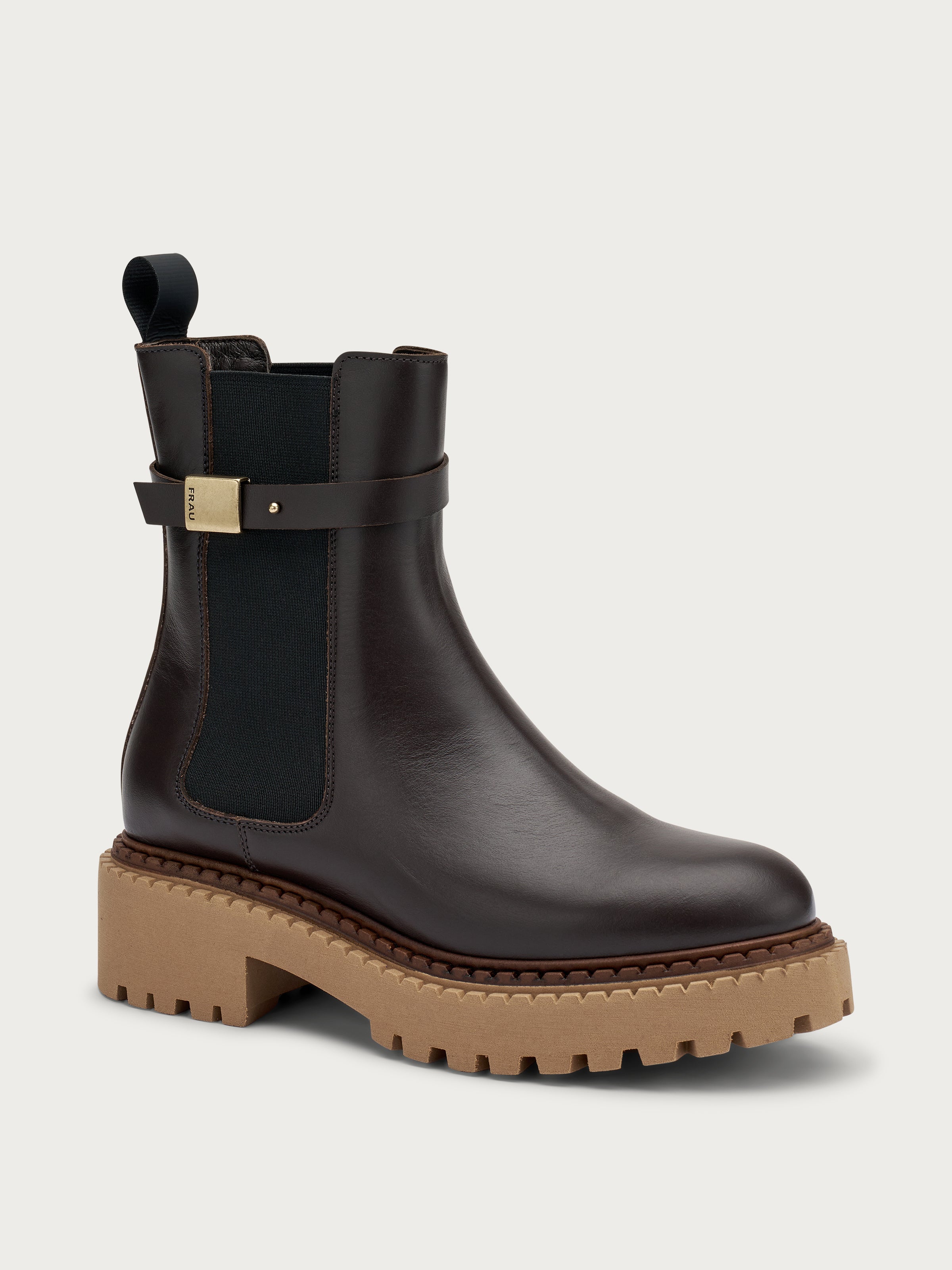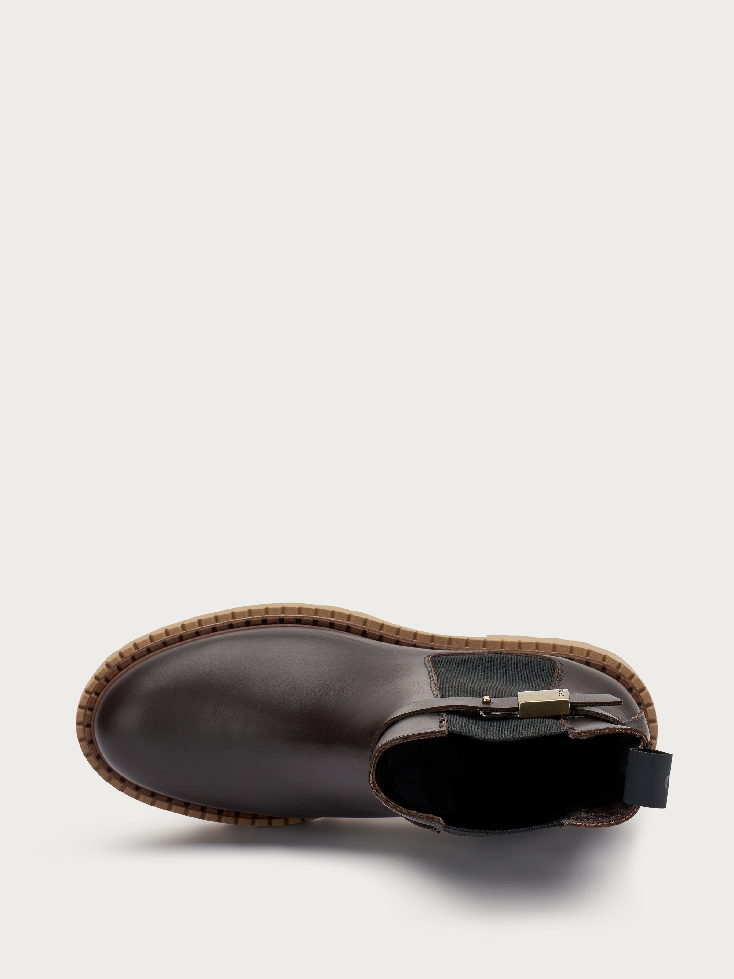 Soft leather Chelsea boots embellished by a strap with burnished gold detail. Easy-on fit thanks to the elastic inserts and double welt, perfect for completing metropolitan looks with a sophisticated twist.