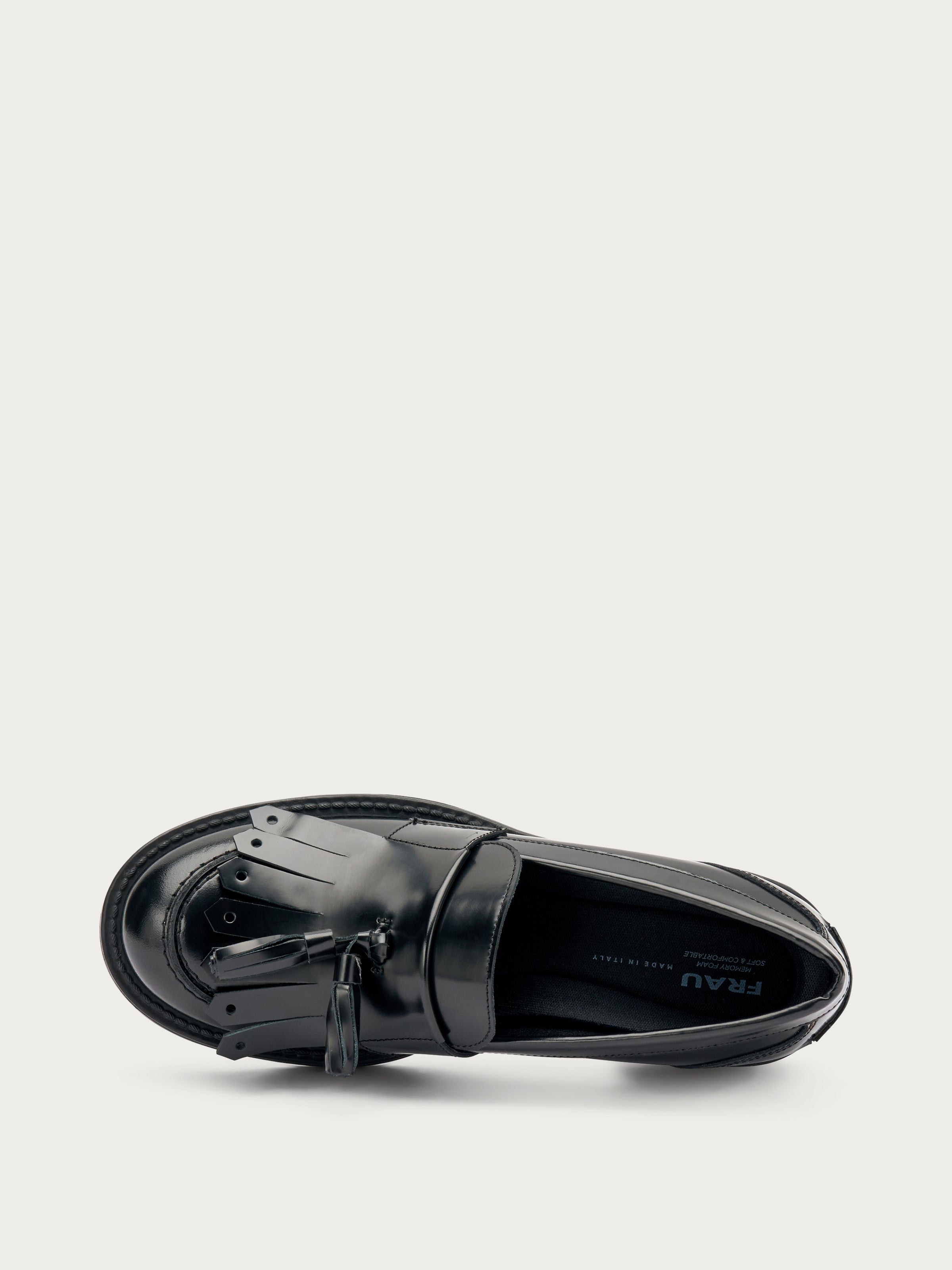 • Polished brushed leather upper with chiaroscuro shading, stitching and small tassels crafted by expert artisans.